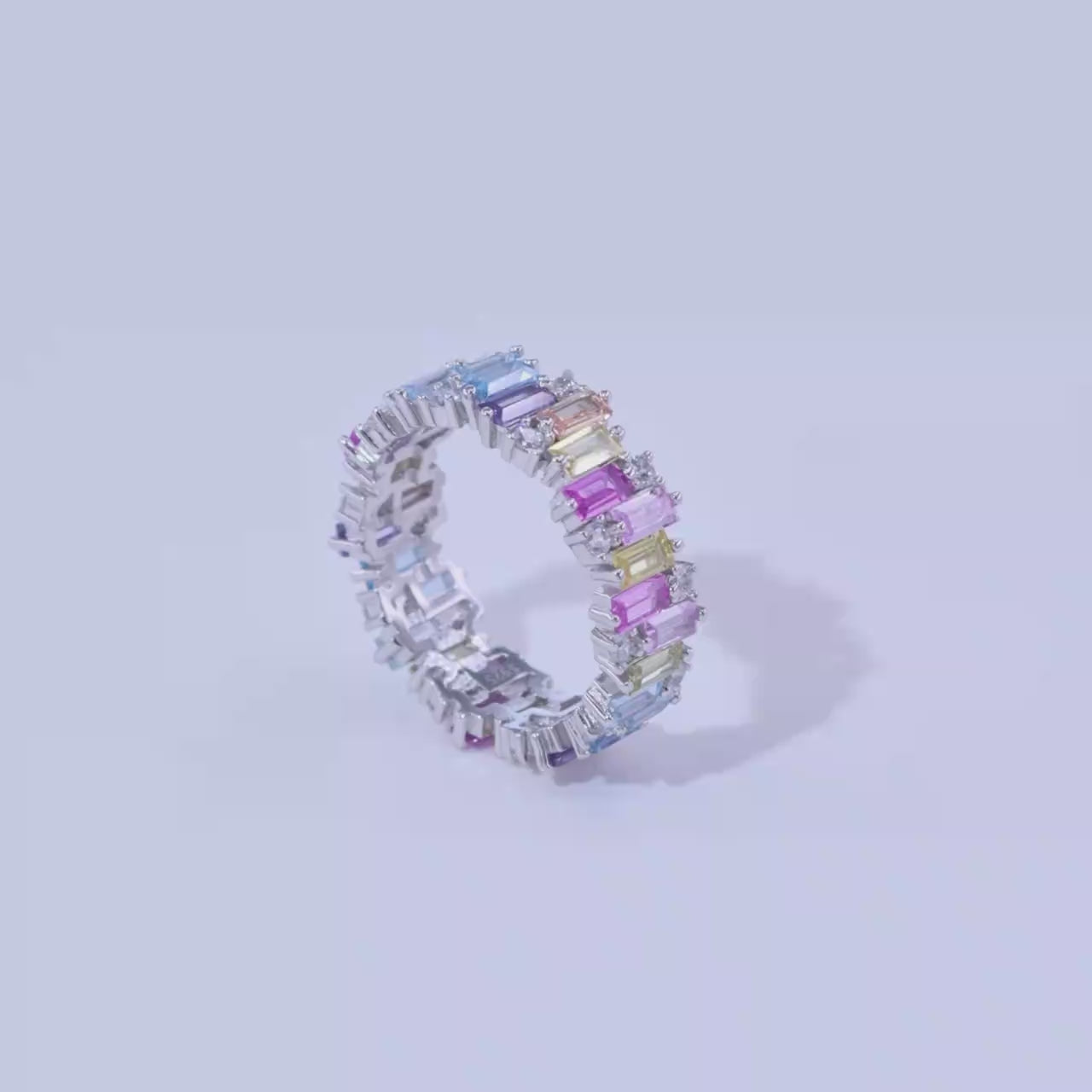 Turn heads with the Alure Ring. Crafted in 925 sterling silver and set with baguette-cut multicolor zircon stones, this eternity band combines striking color with refined elegance.