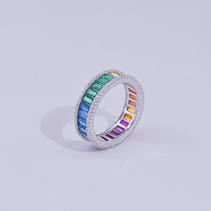 Celebrate color with the Spectrum Ring. Made from 925 sterling silver and set with baguette-cut zircon stones in rainbow hues, this eternity band radiates brilliance from every angle.
